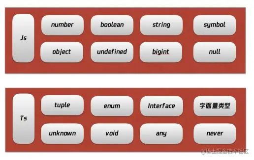 类型体操的主要类型列举在图中。TypeScript 复用了 JS 的基础类型和复合类型,并新增元组(Tuple)、接口(Interface)、枚举(Enum)等类型,这些类型在日常开发过程中类型声明应该都很常用,不做赘述。