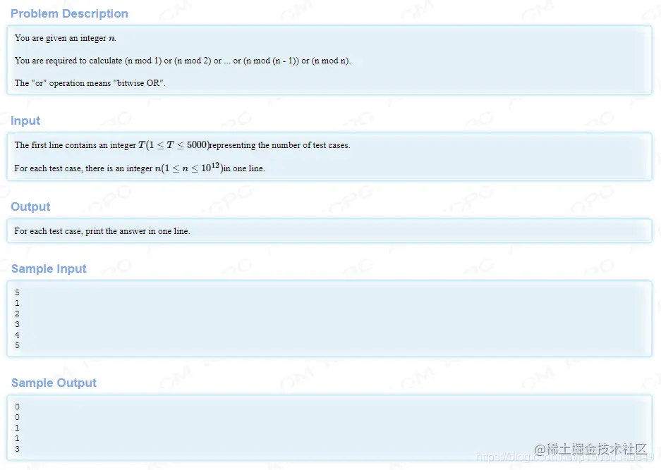 由或的性质可以得知:只需要找到所有模数在二进制位上出现的1的并集即可(并且对于同一模数,多个该模数和单个该模数对答案的贡献一样),而对于此题来说,我们肯定可以在模数中找到一个从1开始且公差为1的等差数列,因而我们只需要找到模数的最大值,就可以得出答案。