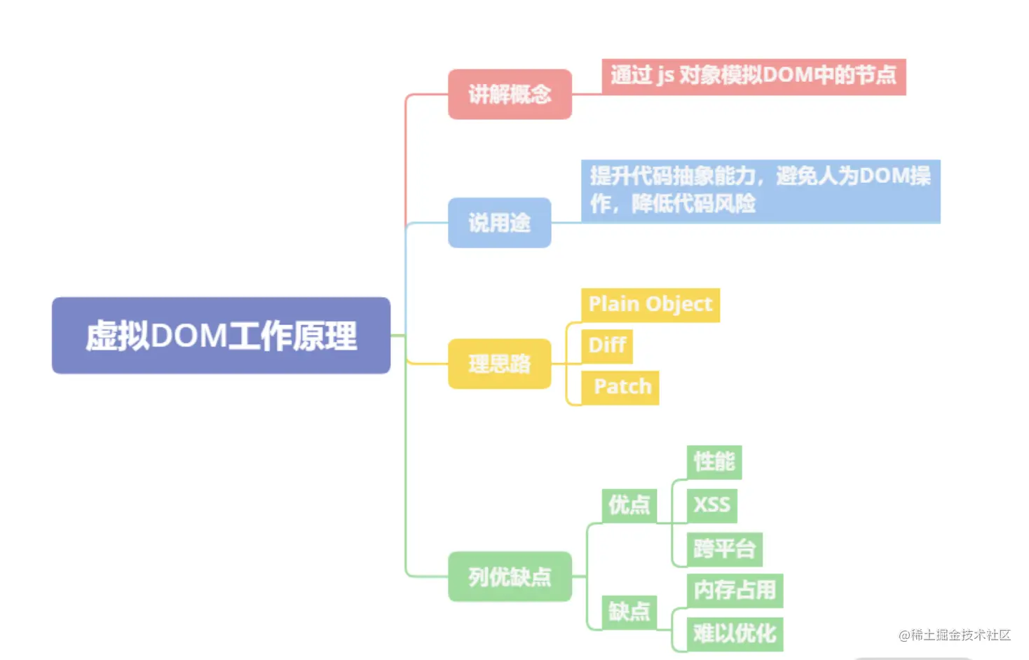 改善大规模DOM操作的性能、规避 XSS 风险、能以较低的成本实现跨平台开发。 - 虚拟 DOM 的缺点在社区中主要有两点