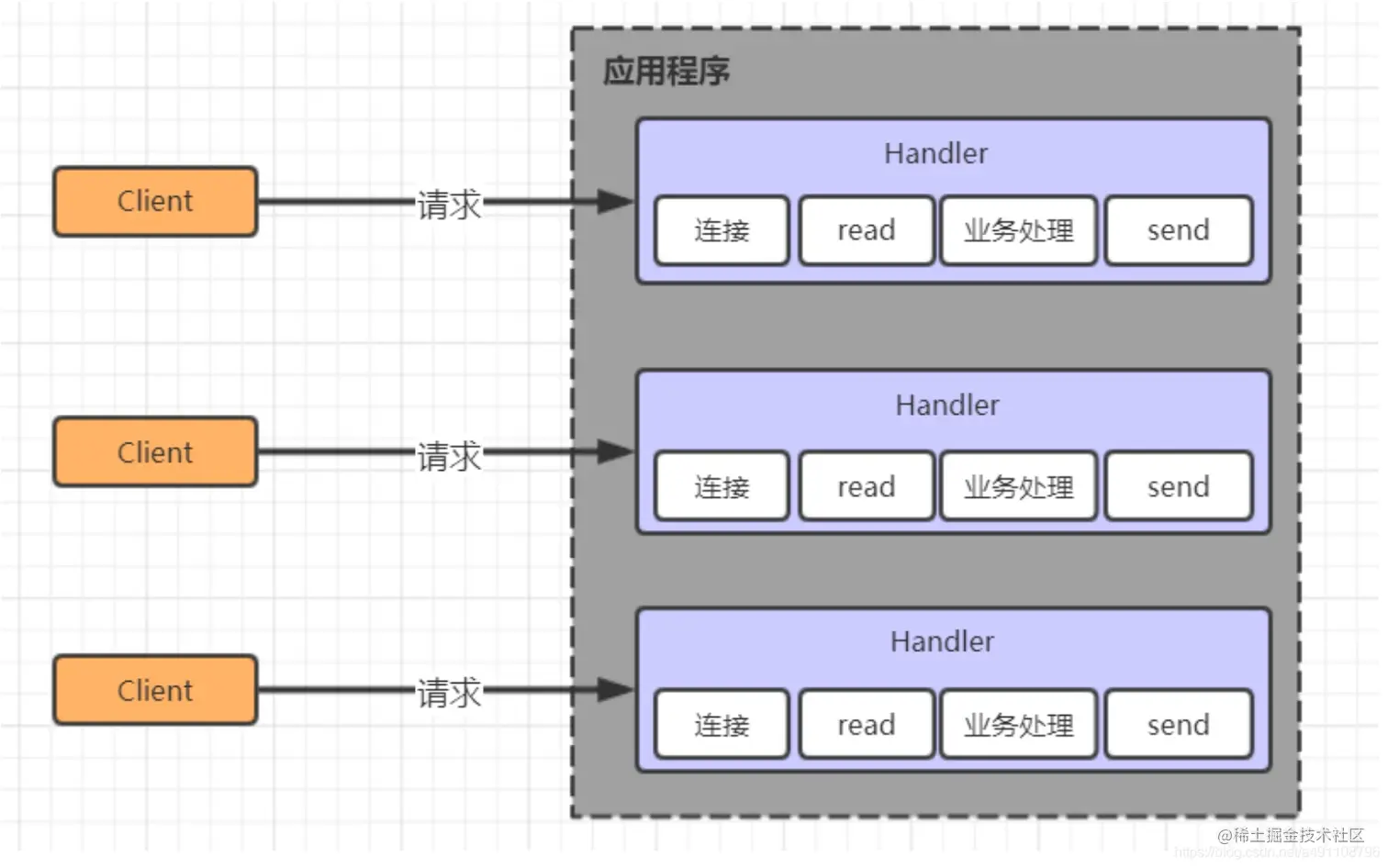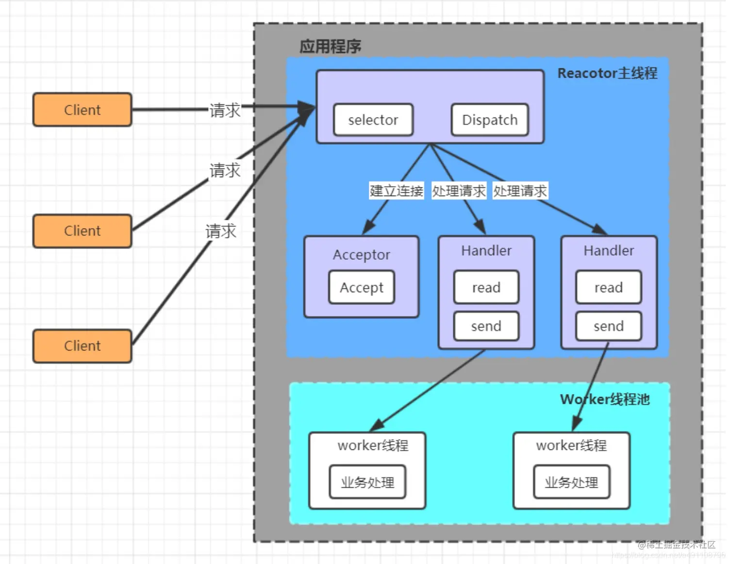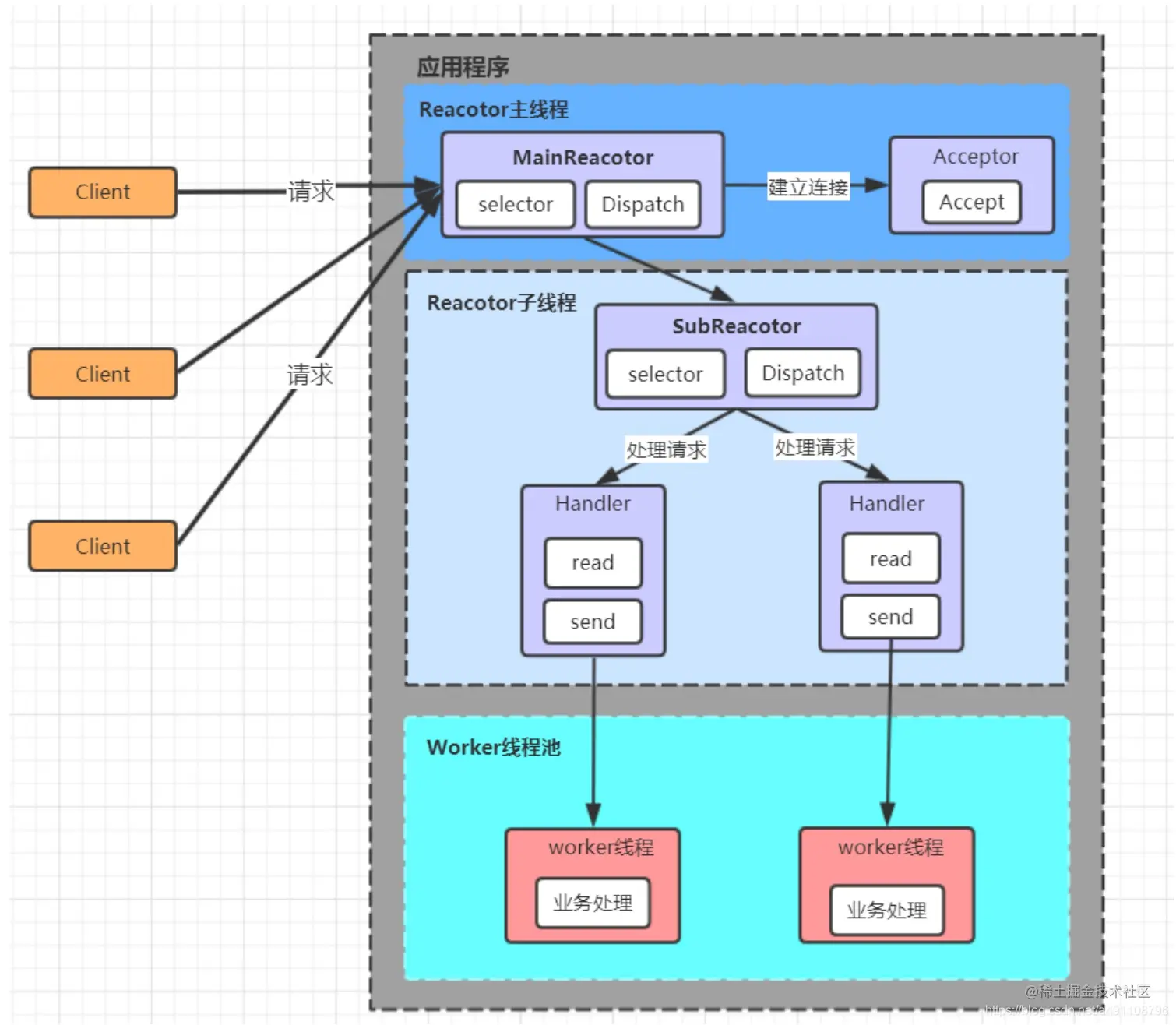 - Handler 通过 read 从连接上读取请求数据,将请求数据分发给 Worker 线程池进行业务处理