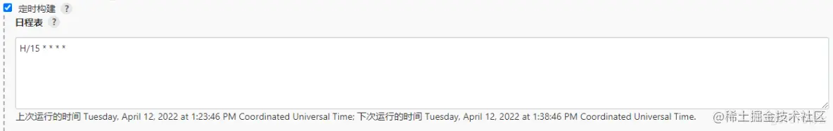 在显示出来的日程表的写入Jenkins支持的定时表达式,Jenkins会根据表达式自动给个提示,显示出下次运行时间,而关于定时表达式的相关内容,我们继续往下看