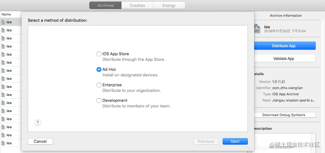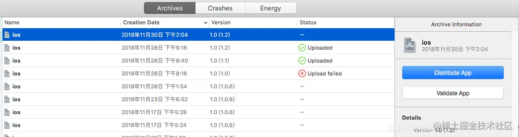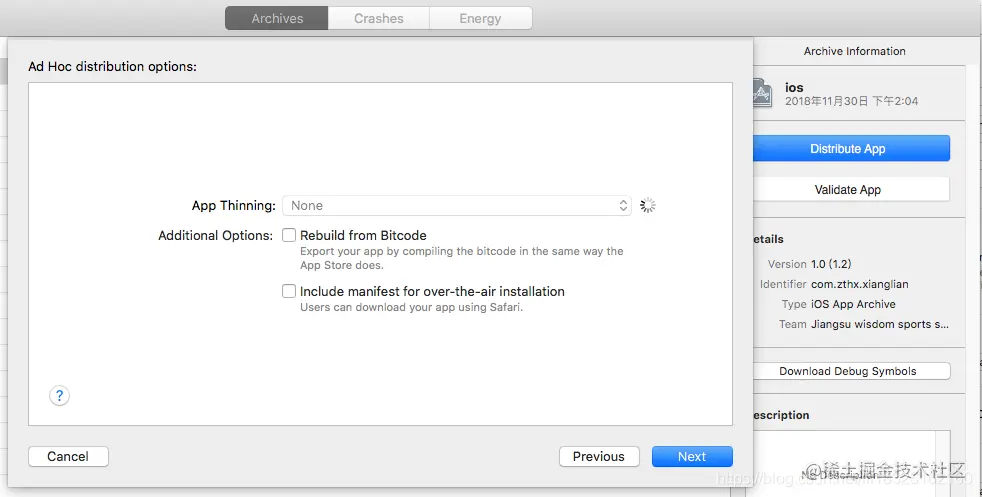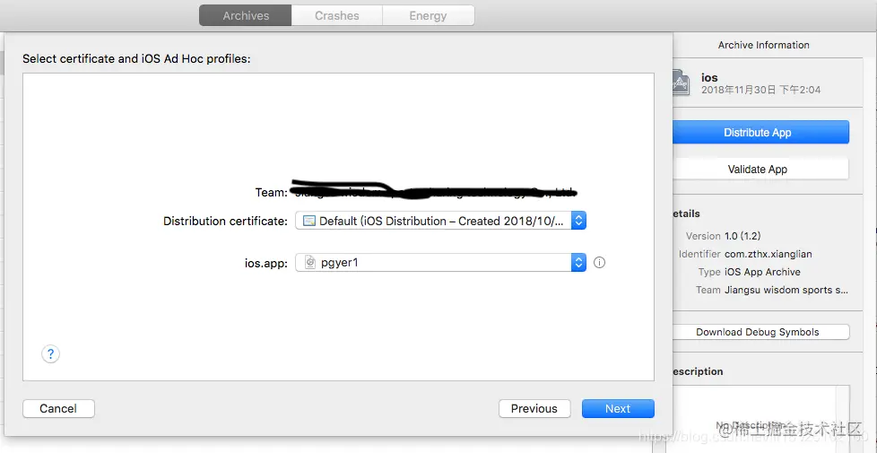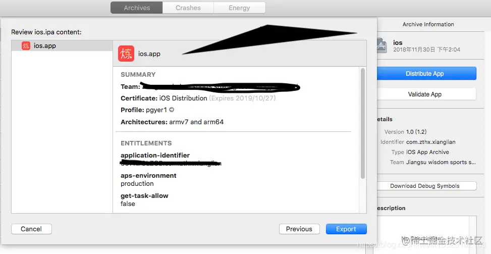 xcode 10 打包到蒲公英操作流程 李发林 2022-09-16 299 阅读1分钟 申请蒲公英账号以及APP开发证书流程(网上有很多,可去自行查看)。 步骤一:archives项目 编辑步骤二:点击Distribute App编辑 步骤三:选择ad Hod(这需要我们在申请开发证书的时候,选择ad Hod类证书),点击next 编辑 如上图所示,去掉勾选 ,点击next 编辑 选择对应的支持文件,点击next 编辑 出现以下页面,点击export,导出到桌面即可。 编辑 \