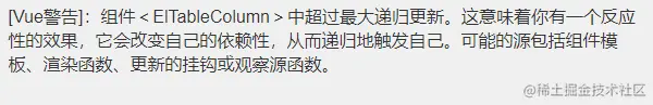 [Vue警告]:组件<ElTableColumn>中超过最大递归更新。这意味着你有一个反应性的效果,它会改变自己的依赖性,从而递归地触发自己。可能的源包括组件模板、渲染函数、更新的挂钩或观察源函数。