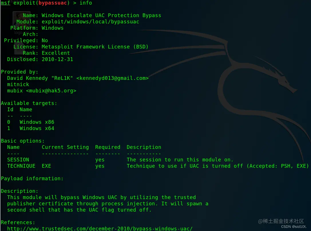 This module will bypass Windows UAC by utilizing the trusted publisher certificate through process injection. It will spawn a second shell that has the UAC flag turned off. 此模块将通过进程注入利用受信任的发布者证书绕过 Windows UAC。它将生成第二个关闭了 UAC 标志的 shell。