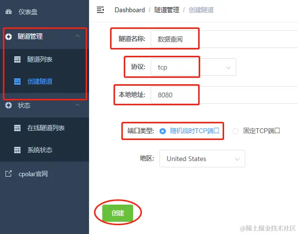 在这个页面,我们就可以对打算建立的数据隧道进行详细设定。由于打算建立的这条隧道主要应用于远程查阅和调取数据,因此我们将其命名为数据查阅;接下来的协议栏位,我们在下拉菜单中选择TCP选项;下一栏本地地址就是指本地系统以哪个端口向外输出数据,这一栏并无过多要求,只要注意不要填入系统本身所占用的端口号即可;接下来的端口类型,我们暂时选择随机临时数据隧道用以演示(如果需要,我们还可以选择建立长期稳定存续的TCP隧道,详细步骤可以参阅《仅需三步 轻松实现远程办公》)。在完成这些设定后,就可以点击下方的“创建”按钮,生成我们专属的远程数据查阅隧道。