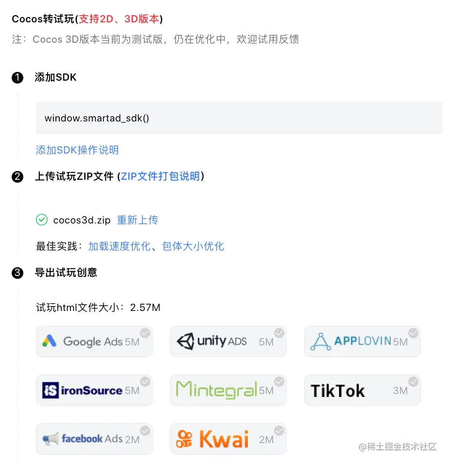 Mintegral、Applovin)的SDK。使用起来也是非常的方便,仅需三步即可把制作好的试玩广告投入到各大平台,不会开发的小白也能轻松搞定;首先第一步是保留试玩广告的核心玩法和高光时刻;第二步在试玩广告中添加落地页和smartad平台的SDK;第三步导出web格式,选择对应游戏引擎上传导出包;