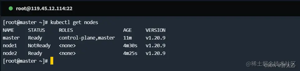 在master 节点上使用 “kubectl get nodes” 来验证集群