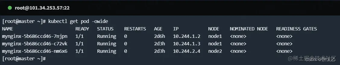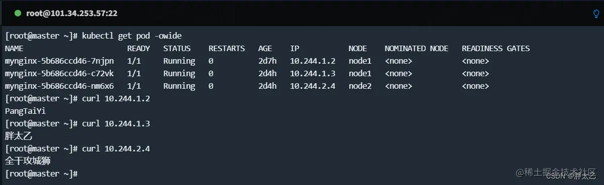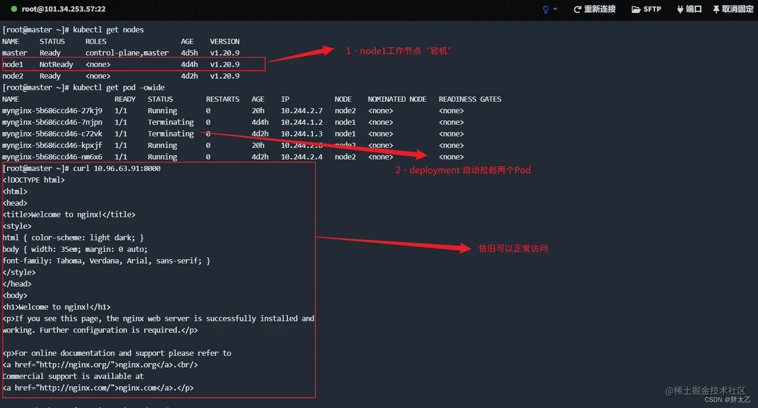 注意: 如上图所示, 当 Deployment 重新拉起Pod, 但是访问的内容并不是之前的内容, 那是因为当时存储的数据是在Pod 中, 并没有将数据挂在出来, 所以导致数据丢失了, 后面的章节会介绍这个知识点。