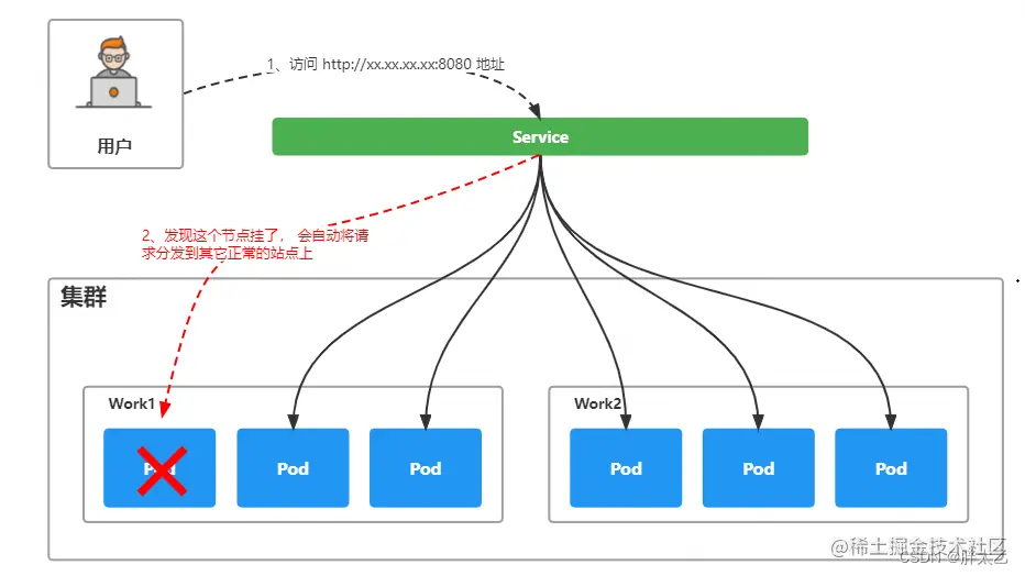 当用户的请求打到 Service 上之后, Service 会自动将请求分发到集群的个个Pod上,当某一个Pod 发生故障, Service 会及时发现, 并且将该Pod “剔除” , 后续请求不会给它。