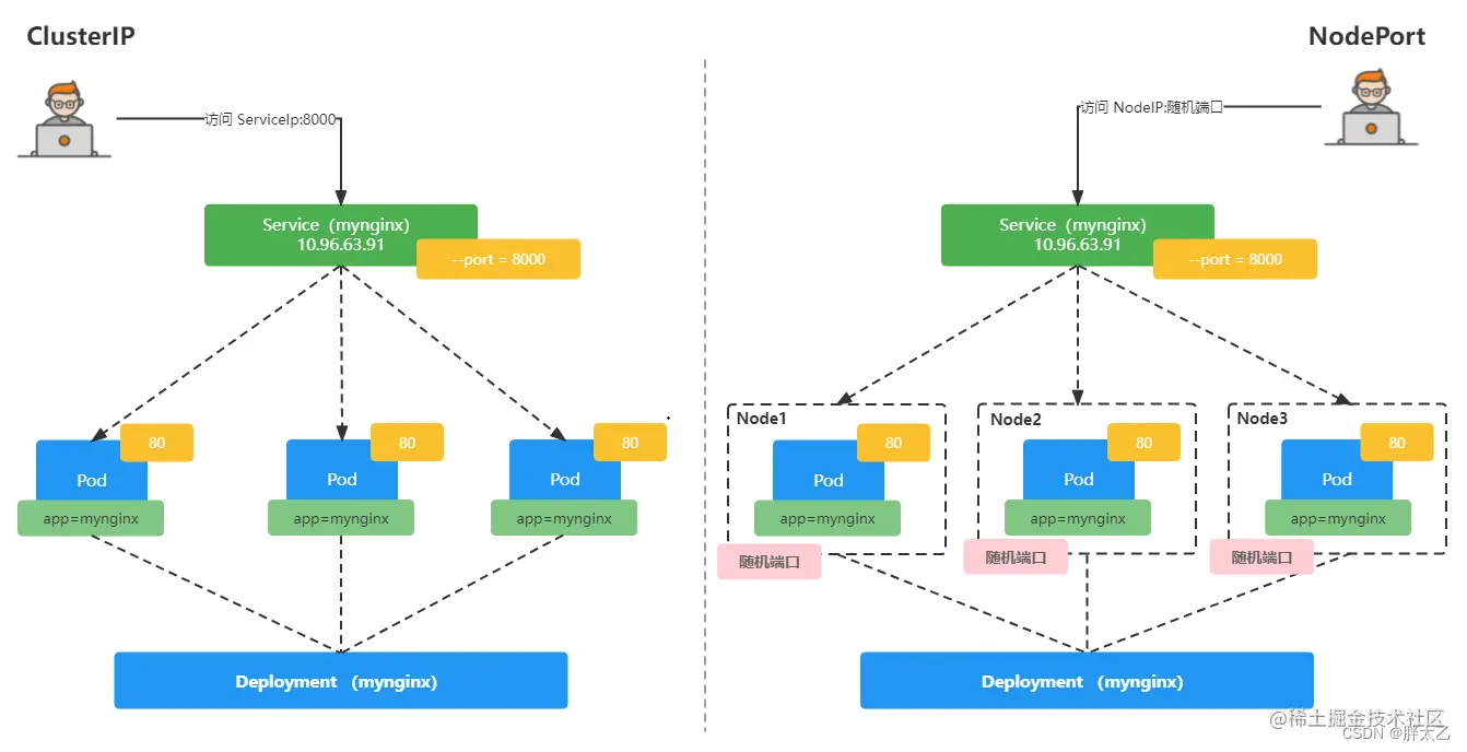ClusterIP 只能在内网访问(ServiceIp 是在内网暴露的IP ), 而 NodePort 会在节点随机暴露一个端口,然后可以使用节点IP进行外网访问。(默认 k8s 随机暴露的端口在 30000 ~ 32767 之间)