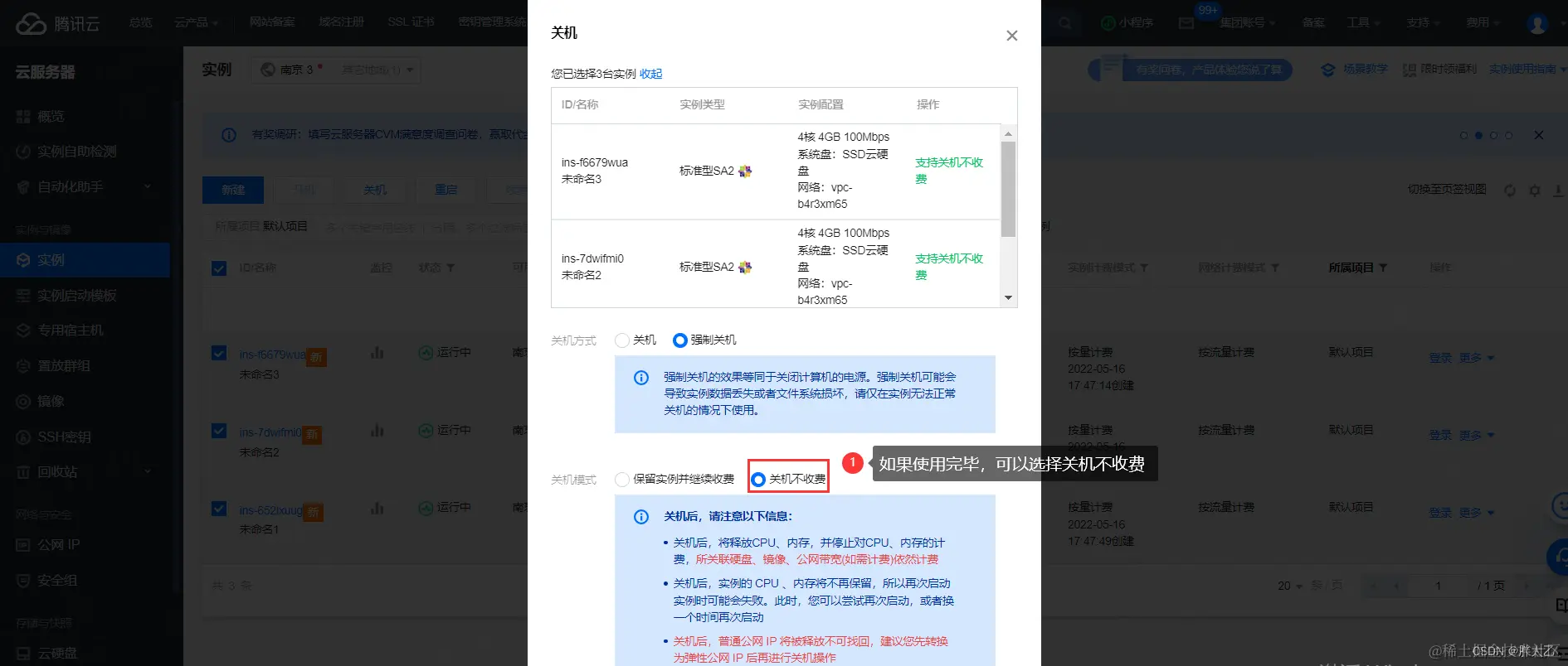 如果使用完毕, 可以选择“关机不收费”, 这样的话, 就只需要支付硬盘租赁的费用, 不需要支付服务器的配置费用, 很划算。第二次开机, 所有环境都在, 唯一变化的就是公网Ip。(硬盘的租赁费用好像一天也就几块钱吧~~~)
