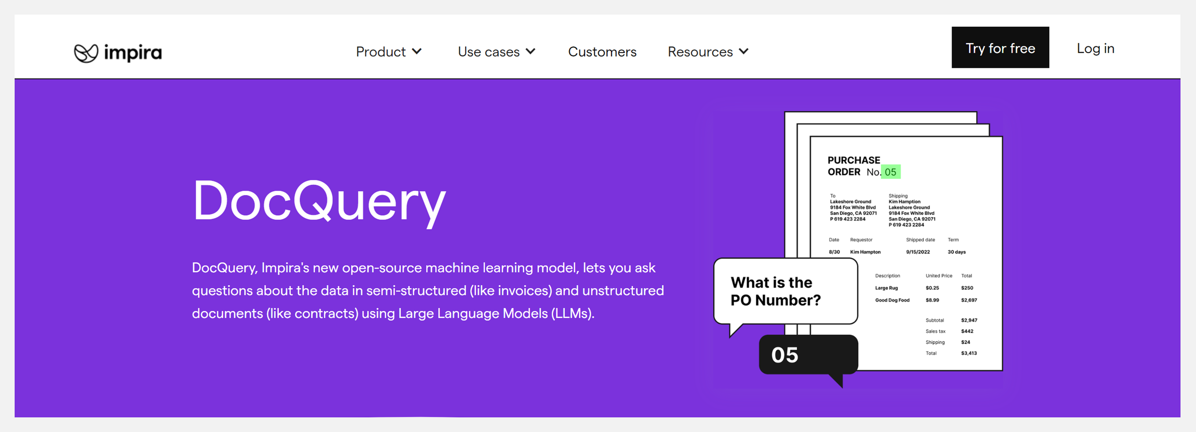 你只需将 DocQuery 指向对应的一个或多个文件,并指定想查询的问题即可。DocQuery 由 Impira 的团队创建。