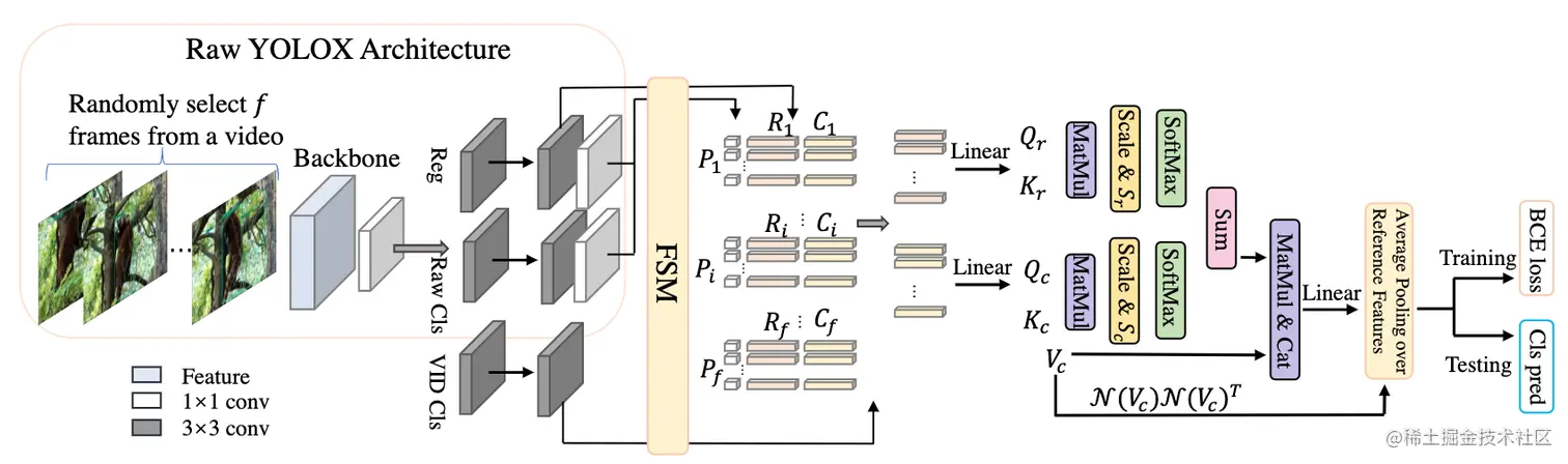 论文摘要:视频物体检测(VID)具有挑战性,因为物体的外观变化很大,而且在某些帧中存在不同的恶化。从正面看,与静止图像相比,视频中某一帧的检测可以从其他帧中获得支持。因此,如何在不同的帧中聚合特征是VID问题的关键所在。大多数现有的聚合算法是为两阶段检测器定制的。但是,由于两阶段的性质,这类检测器的计算成本通常很高。这项工作提出了一个简单而有效的策略来解决上述问题,它在花费边际开销的同时,在精度上也有明显的提高。具体来说,与传统的两阶段流水线不同,我们主张将区域级选择放在单阶段检测之后,以避免处理大量低质量的候选人。此外,我们还构建了一个新的模块来评估目标帧和其参考帧之间的关系,并指导聚合工作。我们进行了大量的实验和消减研究,以验证我们设计的有效性,并揭示了其在有效性和效率方面比其他最先进的VID方法的优势。我们的基于YOLOX的模型可以实现很好的性能(例如,在单个2080Ti GPU上,在ImageNet VID数据集上以超过30 FPS的速度实现87.5%的AP50),使其对大规模或实时应用具有吸引力。实施很简单,演示代码和模型已经在 github.com/YuHengsss/Y… 开放。