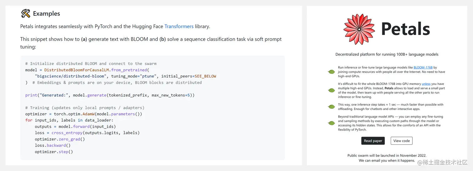 Petals允许加载和服务于模型的一小部分,然后与服务于所有其他部分的人合作,运行推理或微调。除了传统的语言模型 API——工具还可以通过执行模型的自定义路径或访问其隐藏状态来采用任何微调和采样方法。这使得 API 的舒适性和 PyTorch 的灵活性得以实现。