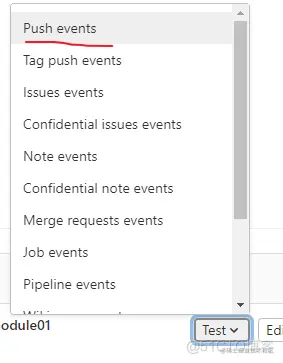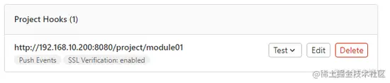 此时最下方会出现一条Webhooks的记录,我们可以通过 Test 按钮进行测试,看看是否可以正常运行