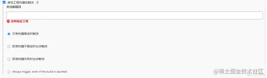 如果我们的项目需要依赖其他项目才能正常执行,此时在构建的时候就有一个先后顺序,我们基于该触发器下的配置项进行构建项目,根据我们所设置的关注项目,最终在构建的时候会形成类似责任链模式的长链