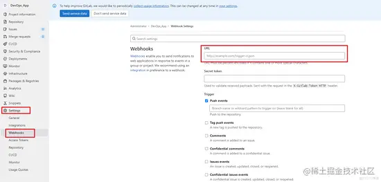进入到 GitLab上该项目页面,从 settings>Webhooks 找到对应的配置页面,将复制到的URL添加到指定的位置中就可以了