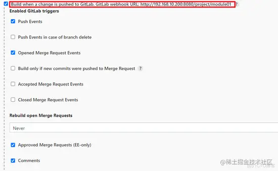 - 当我们对GitLab仓库进行操作(提交代码,合并分支)之后,GitLab会向对应配置的接口中发送http请求,Jenkins接收到请求之后会对当前项目作出构建的操作。这样我们就能够实现自动化CI操作,减少部署成本