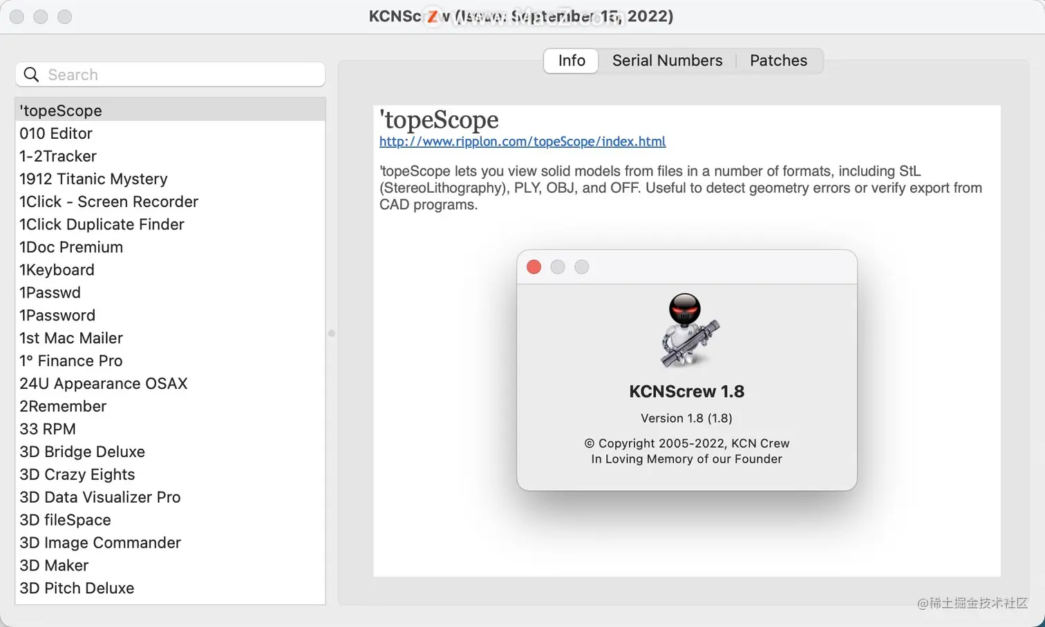 KCNScrew是一款强大的Mac序列号查询工具,可以帮助您查Quicktime、Logic、Adobe等软件的序列号,KCNScrew Key每月都会更新最新的软件序列号。