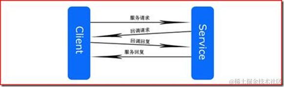 这是一种比较典型的双工消息交换模式的表现形式,客户端在进行服务调用的时候,附加上一个回调对象;服务在对处理该处理中,通过客户端附加的回调对象(实际上是调用回调服务的代理对象)回调客户端的操作(该操作在客户端执行)。整个消息交换的过程实际上由两个基本的消息交换构成,其一是客户端正常的服务请求,其二则是服务端对客户端的回调。两者可以采用请求-回复模式,也可以采用单向(One-way)的MEP进行消息交换。图1描述了这样的过程,服务调用和回调都采用请求-回复MEP。