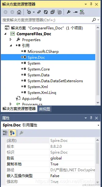 本文以C#和VB.NET代码为例,来介绍如何对比两个Word文档差异。程序中使用最新版的Spire.Doc for .NET 版本*8.8.2*。编辑代码前,先在VS程序中添加引用Spire.Doc.dll文件,如下: