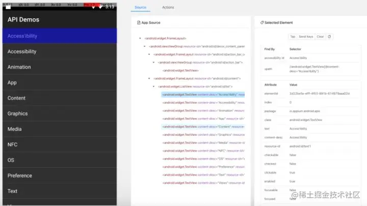 通过图片分析,android.widget.TextView 是文本类型的节点,其中包含的属性信息都在上面的 uiautomatorviewer 快照图中有展示。如果只想定位 Android 系统的页面元素,可以直接使用 uiautomatorviewer,速度快并且不需要配置任何参数,直接点击获取页面的图标就可以将客户端页面抓取出来。