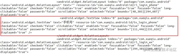 uiautomatorviewer 抓取快照展示出来的元素属性是经过解析的,如果想要查看 XML DOM 的真实结构可以打印 pagesource ,得到的内容如下,红色框起来的部分为上图的定位的 XML DOM 中的一个节点: