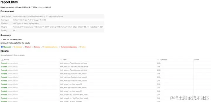 生成的测试报告最终是 HTML 格式,报告内容包括标题、运行时间、环境、汇总结果以及用例的通过个数、跳过个数、失败个数、错误个数,期望失败个数、不期望通过个数、重新运行个数、以及错误的详细展示信息。报告会生成在运行脚本的同一路径,需要指定路径添加–html=path/to/html/report.html 这个参数配置报告的路径。如果不添加 --self-contained-html 这个参数,生成报告的 CSS 文件是独立的,分享的时候容易千万数据丢失。