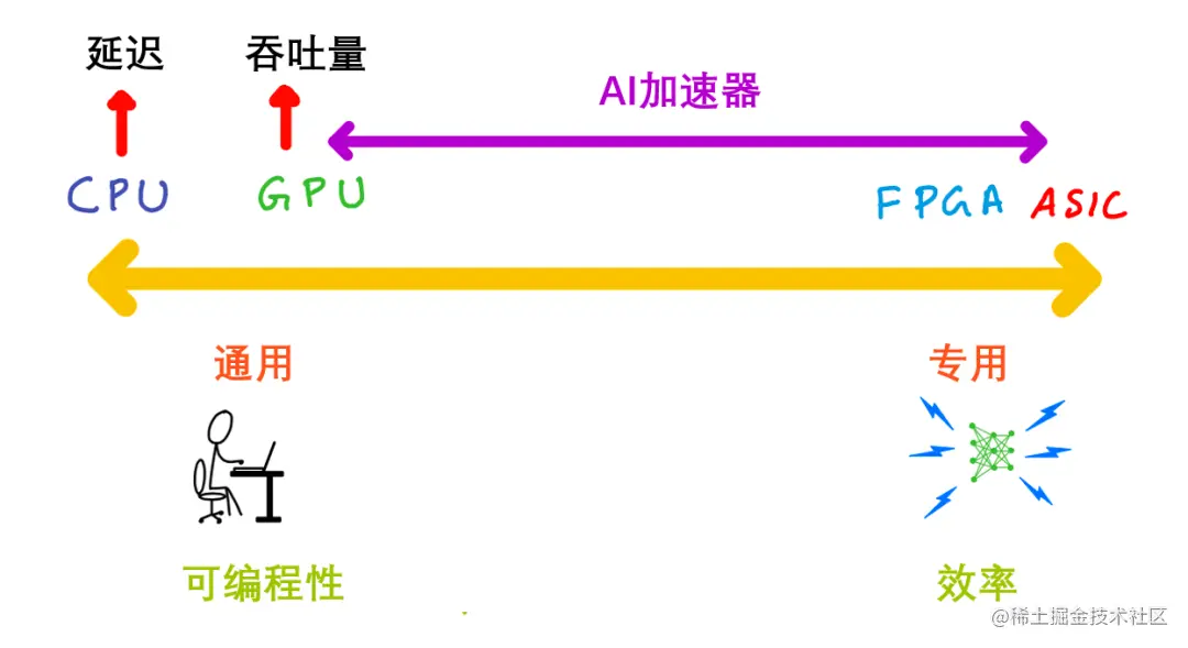 上图中,越靠左代表通用性和可编程性越强;越靠右代表专用性和效率越高。那么GPU、FPGA和AI加速器分别处于图中什么位置呢?