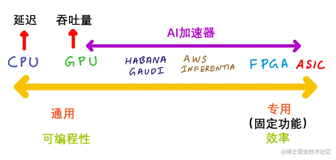 Intel的Habana Gaudi处理器、AWS的Trainium和Inferentia芯片等AI加速器则处在GPU的右侧。Habana Gaudi处理器具备可编程性,但通用性比GPU更低,所以应处GPU右侧。AWS的Inferentia芯片不可编程,但可以加速多种操作,如果你的ML模型不支持这些操作,Inferentia就会执行CPU回退(fallback)模式。综上,Inferentia应处Habana Gaudi的右侧。