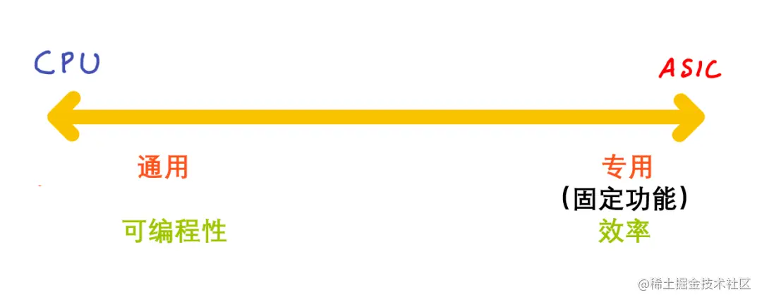 如上图所示,最具通用性的是CPU,可以运行任意代码。专用芯片可执行的任务,CPU也能执行,如图像处理、语音处理、机器学习等。然而,CPU的性能和能效都比较低。