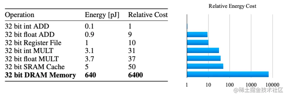 在推理任务中,模型权重和激活函数输出均可被量化,例如可将FP32(训练常用精度)转化为更低精度的表示形式(FP16、BF16和INT8)。使用较低精度可以获得更高的性能和能效。当把FP32转化为FP16操作时,数据大小可减半,能耗可减少约75%(数据来源:arxiv.org/pdf/1506.02… ) ,使用的硅面积(silicon area)也可减少约75%。