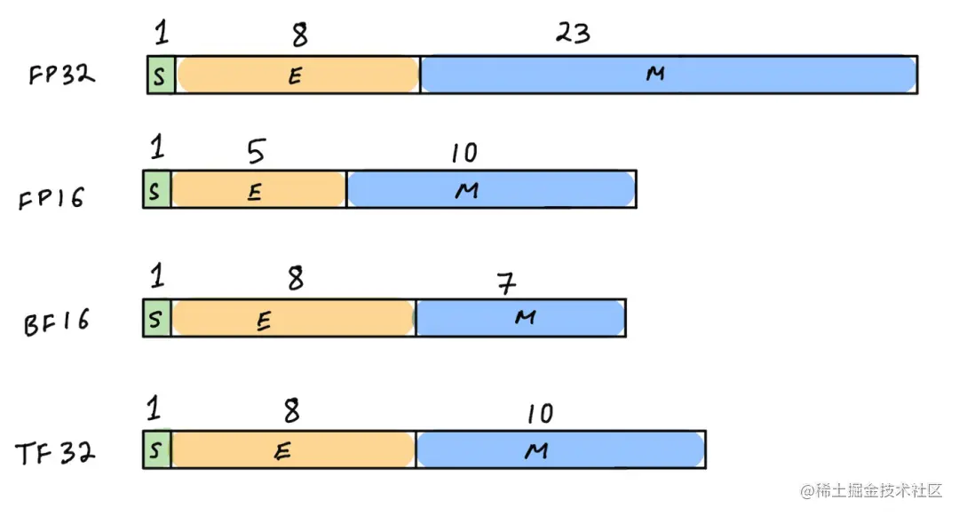 - NVIDIA Ampere架构(2020)的Tensor Core还支持BF16和TF32,也就是说,它可以执行FP16、BF16和TF32运算,并且用FP32累积结果,以实现混合精度