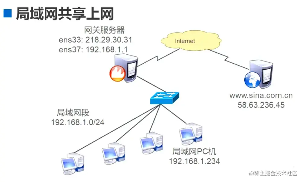 当内部地址要访问公网上的服务时(如web访问),内部地址会主动发起连接,由路由器或者防火墙上的网关对内部地址做个地址转换,将内部地址的私有IP转换为公网的公有IP,网关的这个地址转换功能称为SNAT,主要用于内部共享IP访问外部网络。