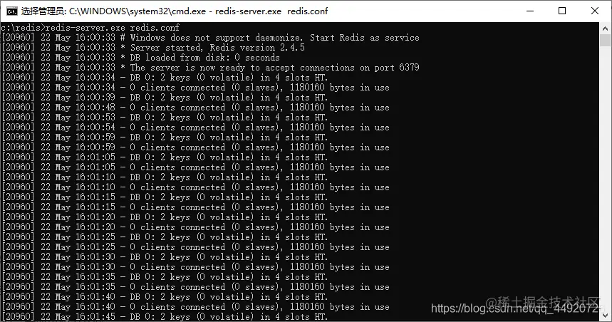 打开一个cmd窗口 使用cd命令切换目录到 C:\redis 运行 redis-server.exe redis.conf 。