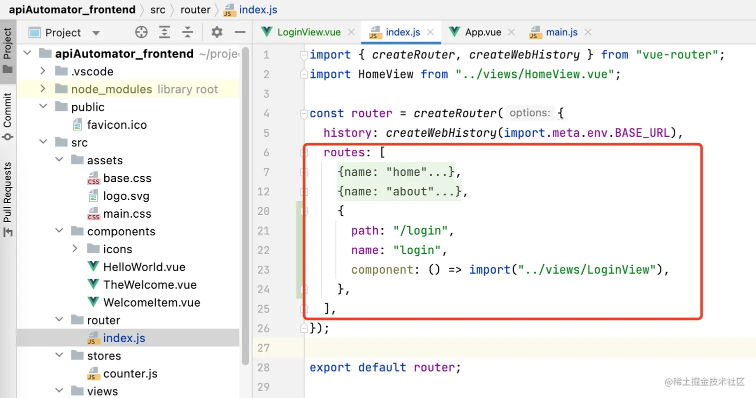 编写登录页面主要就是在这3个区域完成。为了能够访问到新建的登录页面,还需要设置路由到这个页面,打开src/router/index.js文件,配置路径/login路由到LoginView。