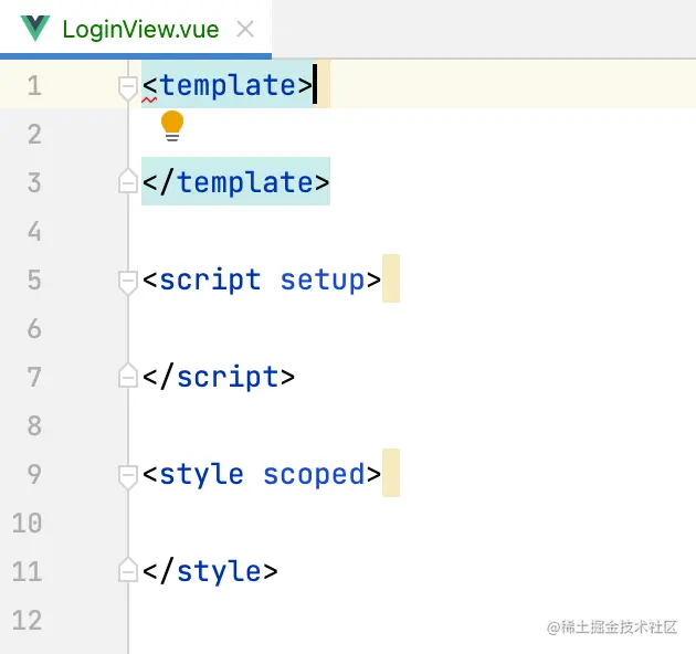 在views目录中创建LoginView.vue文件,创建完成后可以看到代码编写主要分为3个区域: