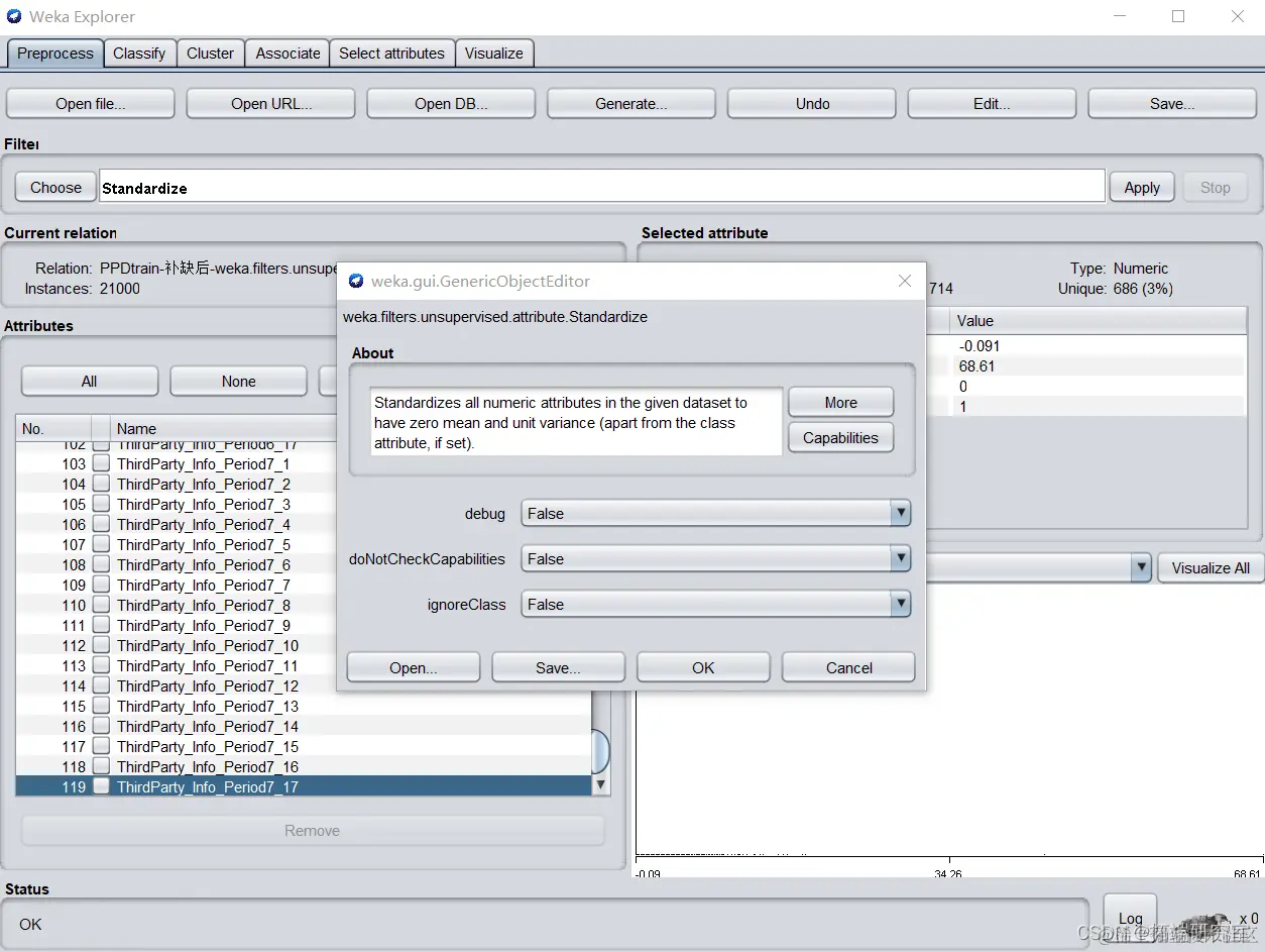 将ThirdParty字段属性标准化,在预处理界面选用unsupervised. attribute. Standardize,标准化给定数据集中所有数值属性的值到一个0均值和单位方差的正态分布。