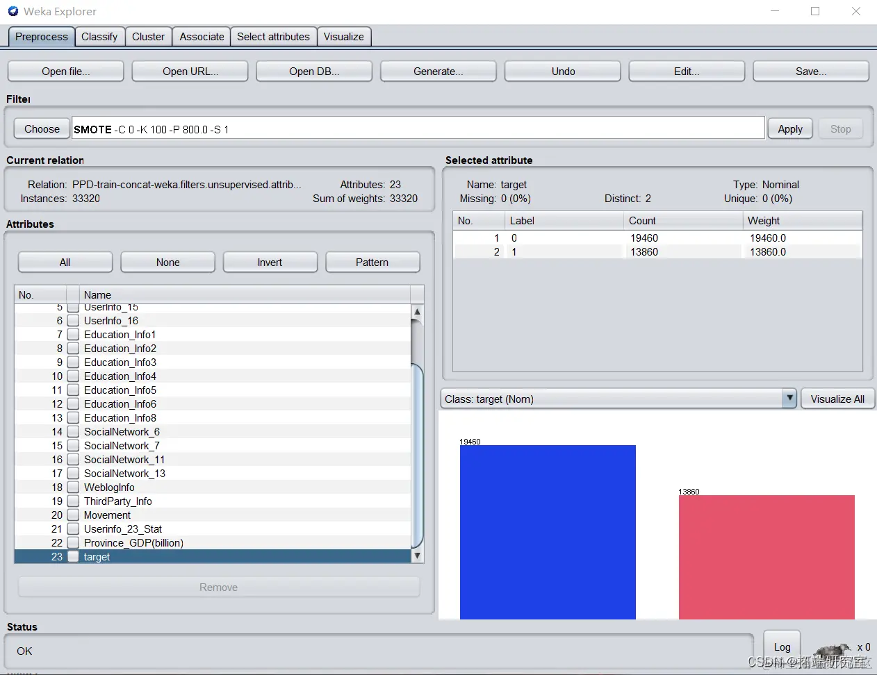 - 再抽样。target属性中发现Lable为1(即存在违约风险)的频数较小。为防止进行分类建模时学习不到小类特征,运用SMOTE包增加小类数量,加大小类比例,以便后续机器学习。设置参数percentage为800%,实例数量扩大为原来的8倍。为防止抽样范围过小造成数据与原数据比例失衡,设置nearestNeighbors为100.