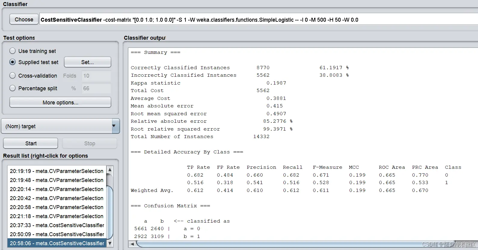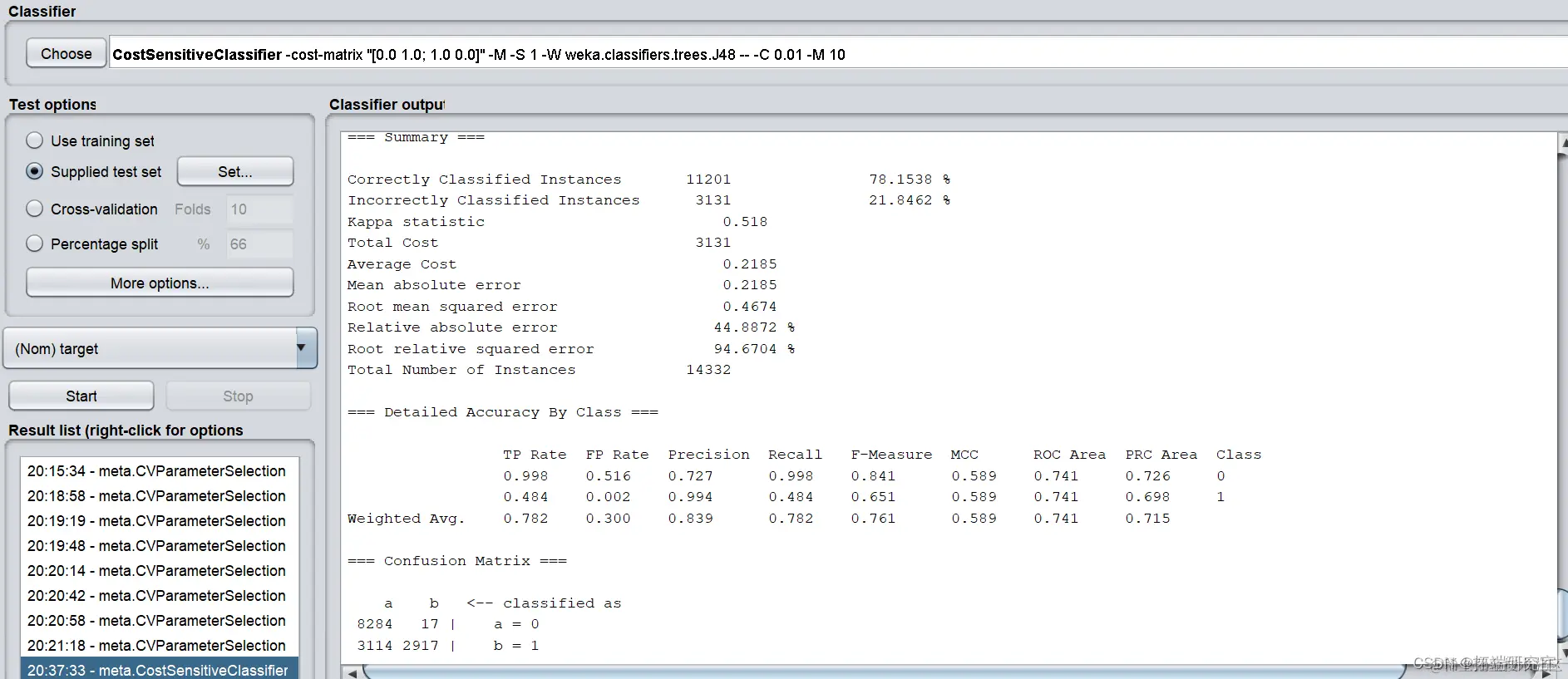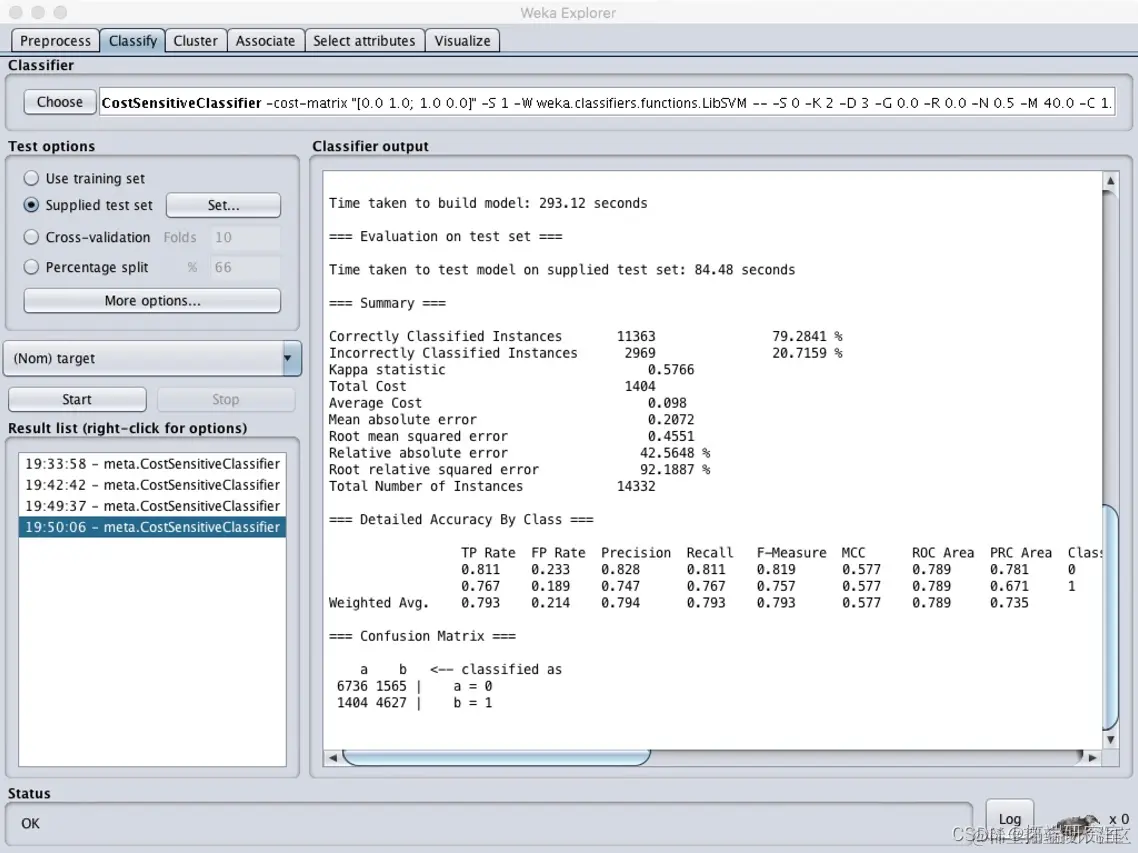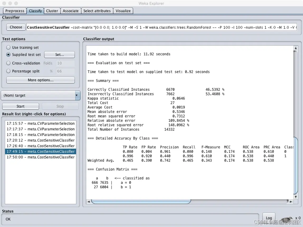 在经过处理后的测试集上进行测试,在more options中选择cost sensitive,并将左下至右上对角线上数值均设为1。