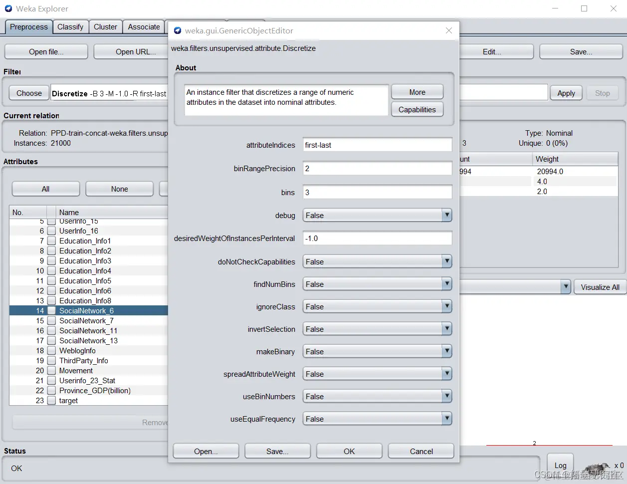 其次对其他数值型属性进行离散化。在预处理界面选择Discretize,根据第一次作业结果判断,设置bins为3,分类区间取小数点后两位。