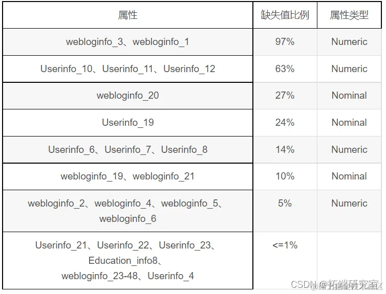 删除数据集中distinct为1的属性webloginfo_10、Education_info7、webloginfo_49,此类属性仅存在同一个数值,对分类结果无影响。