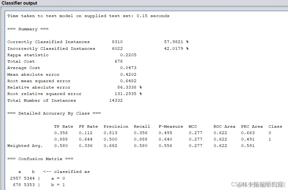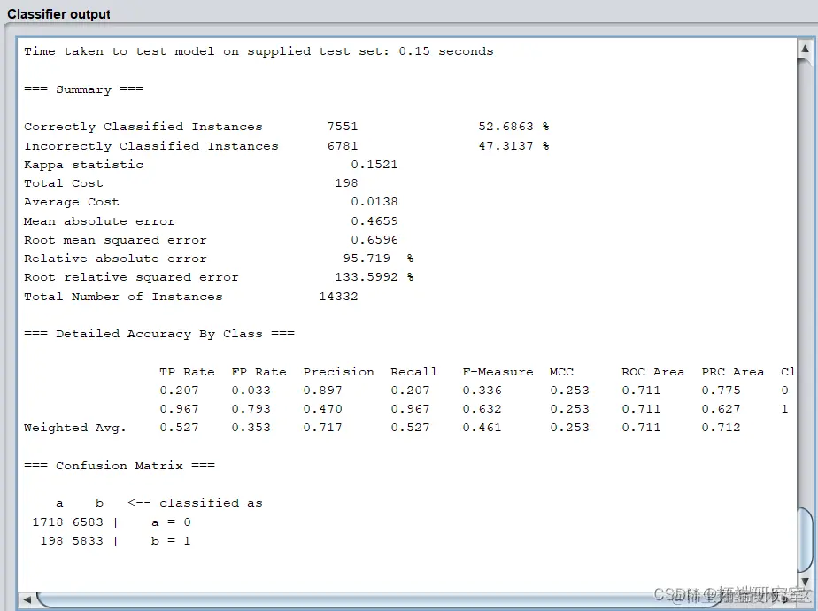 模型的正确率仅52.6863%,识别率=召回率=0.527,F-Measure=0.467,模型各项指标很差,而且模型不稳定。