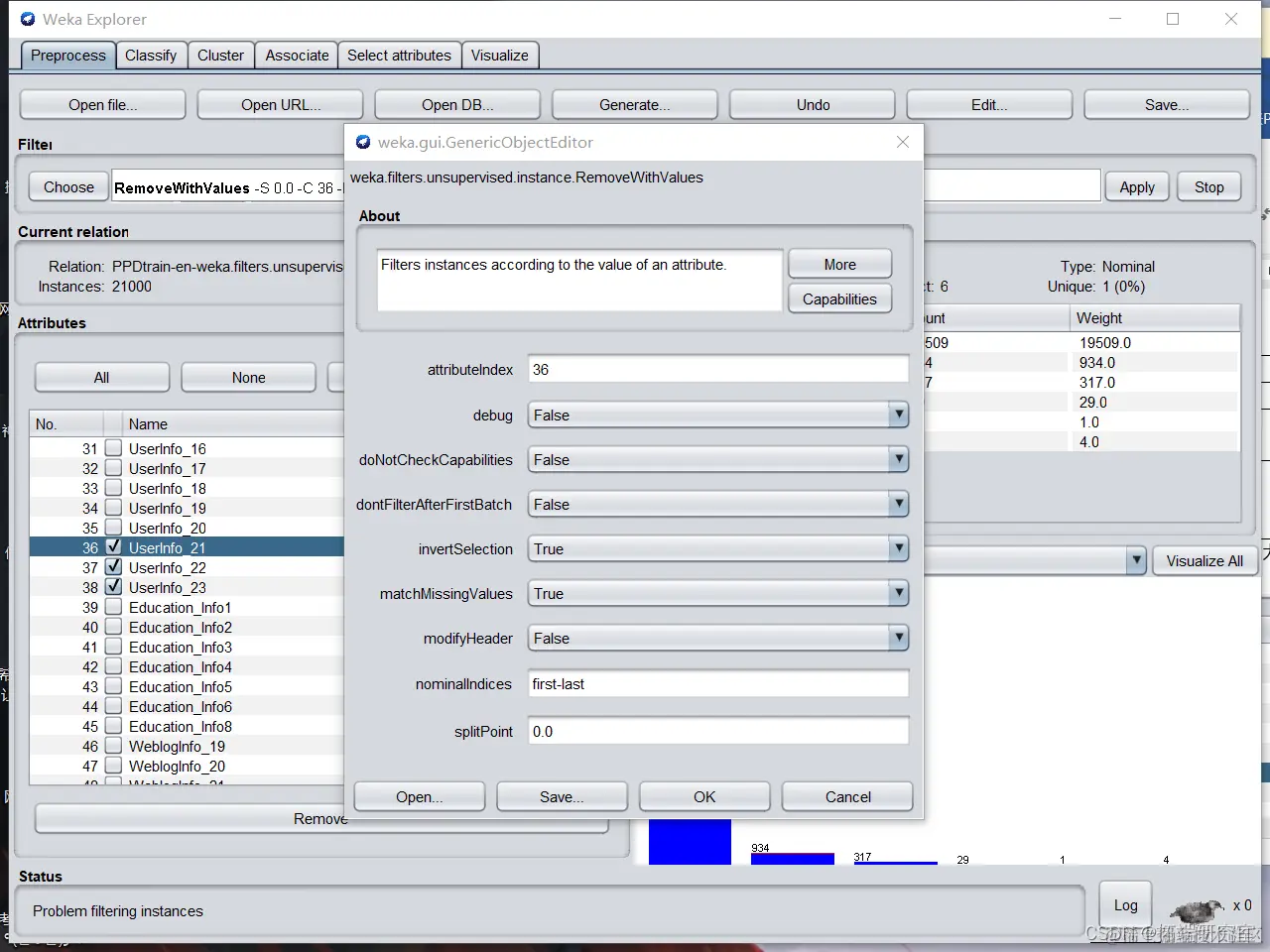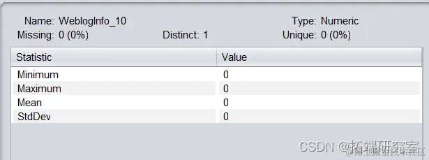 对于属性webloginfo_3、webloginfo_1,由于缺失值比例过大,直接删除两属性。操作步骤为预处理界面勾选两属性,点击Remove。