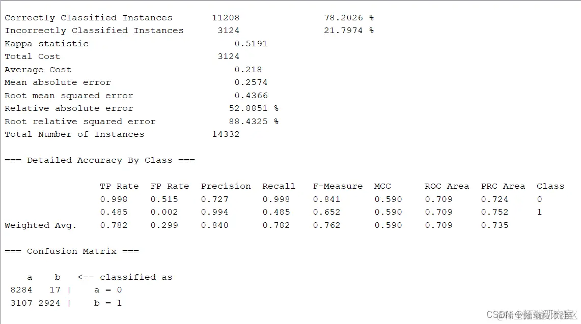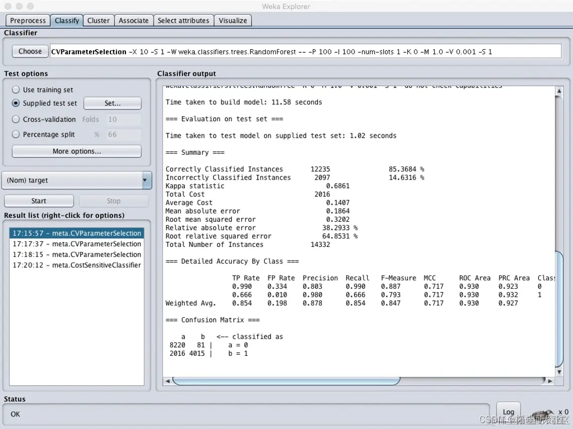 同时调整cost sensitive为左下至右上数值均为1,得出结果为: