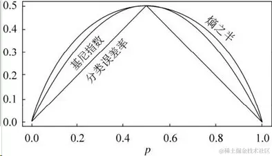 基尼系数和熵之半的曲线非常接近,因此,基尼系数可以做为熵模型的一个近似替代。