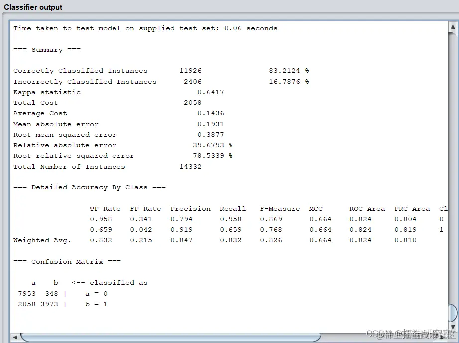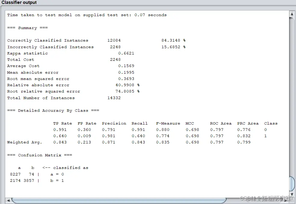 模型正确率为84.3148%,识别率=召回率=0.843,F-Measure=0.835。
