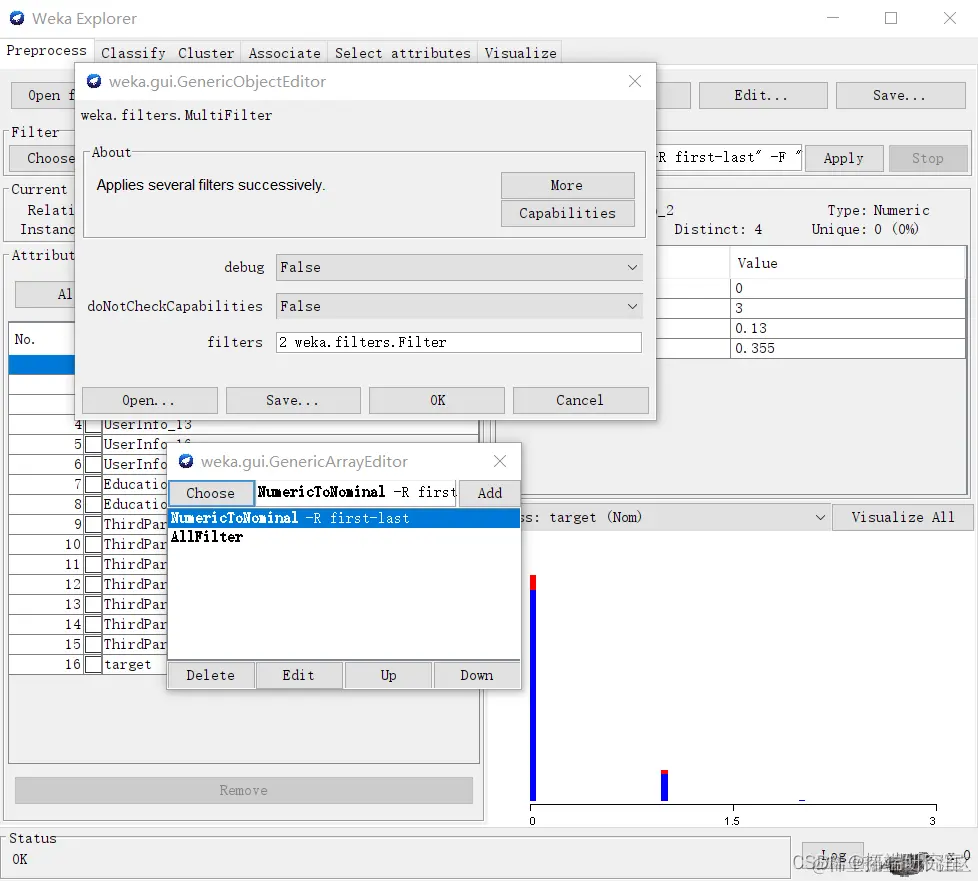 使用“NumerictoNominal”过滤器实现Numeric属性的离散化,为方便处理使用MultiFilter对所有Numeric属性进行操作。